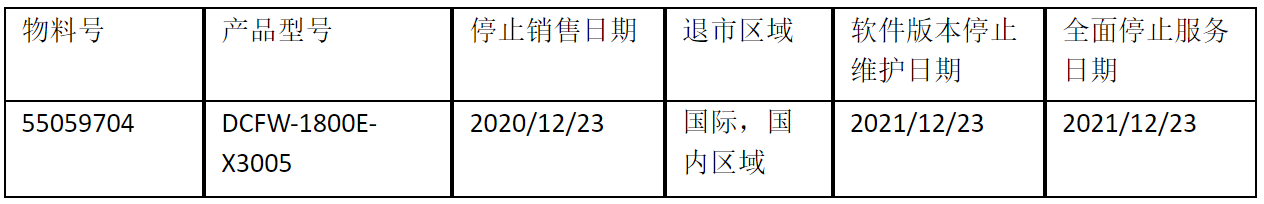 北京神州数码金年会信息技术有限公司正式通知您, 以上DCFW-1800E-X3005下一代防火墙(55059704)将于2020年12月23号停止接收新的订单(具体日期见上表),不再供货。给您带来的不便,敬请原谅。